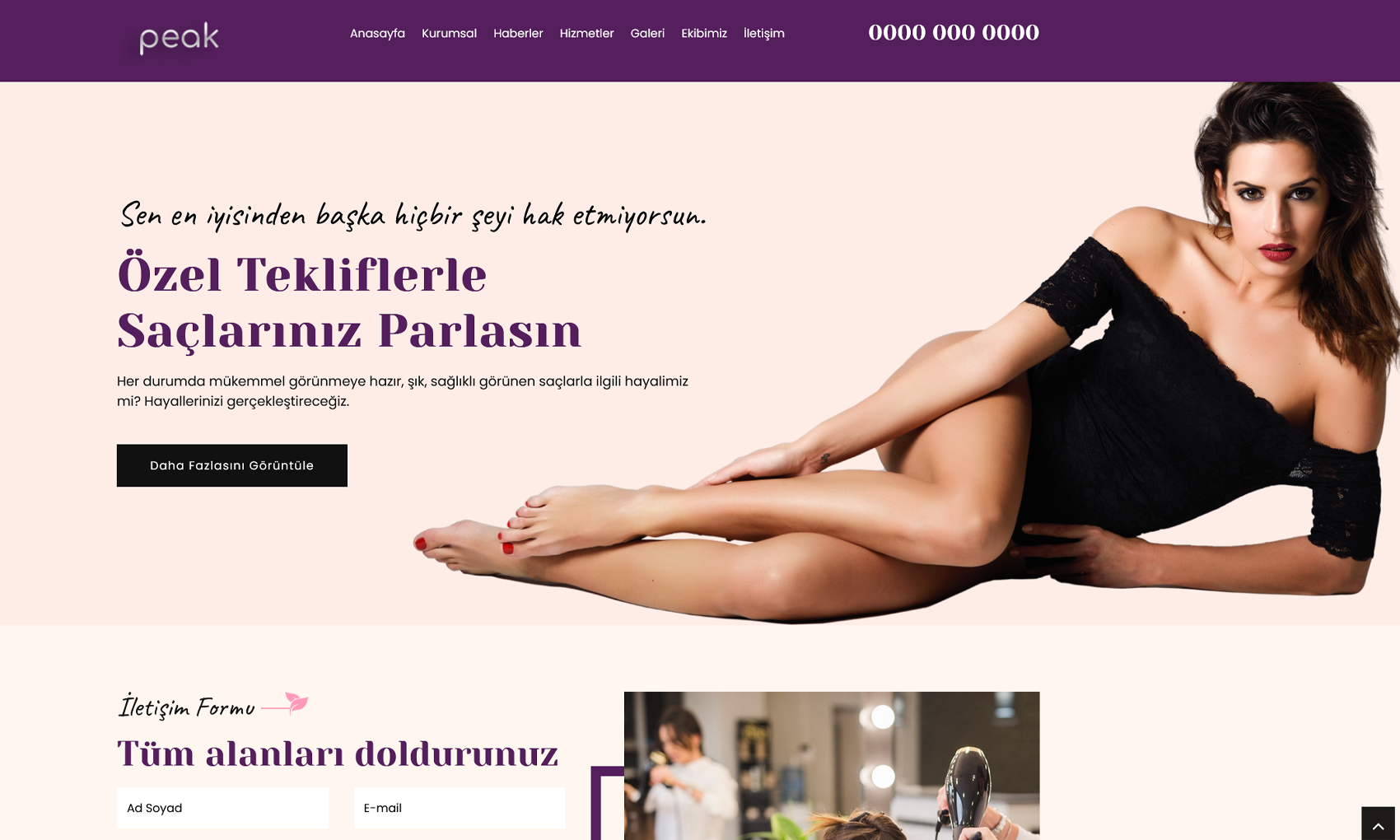 Bu tasarım, güzellik salonları, spa merkezleri, kuaförler, estetik klinikleri ve kişisel bakım hizmetleri sunan birçok farklı sektöre uyum sağlayacak şekilde geliştirilmiştir. Hizmetlerinizi, ürünlerinizi, kampanyalarınızı ve uzman kadronuzu şık ve modern bir arayüzle tanıtarak potansiyel müşterilerinizi büyüleyin. Online randevu sistemleri ve görsel galeri desteği ile müşteri deneyimini zenginleştirin.